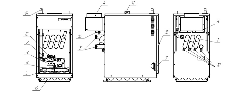 9. Глазок для розжига и контроля пламени 10. Сливная пробка 11. Транспортировочные проушины 12. Регулятор температуры 13. Дверка 14. Патрубок для присоединения к газопроводу 15. Решетка для регулировки подачи воздуха 16. Предохранительный клапан |